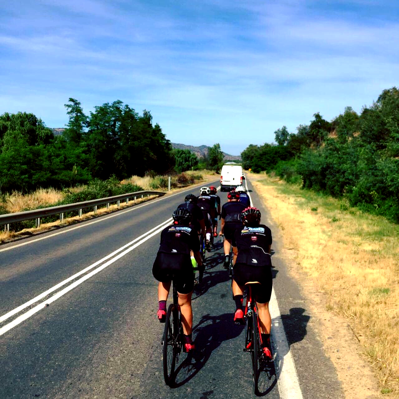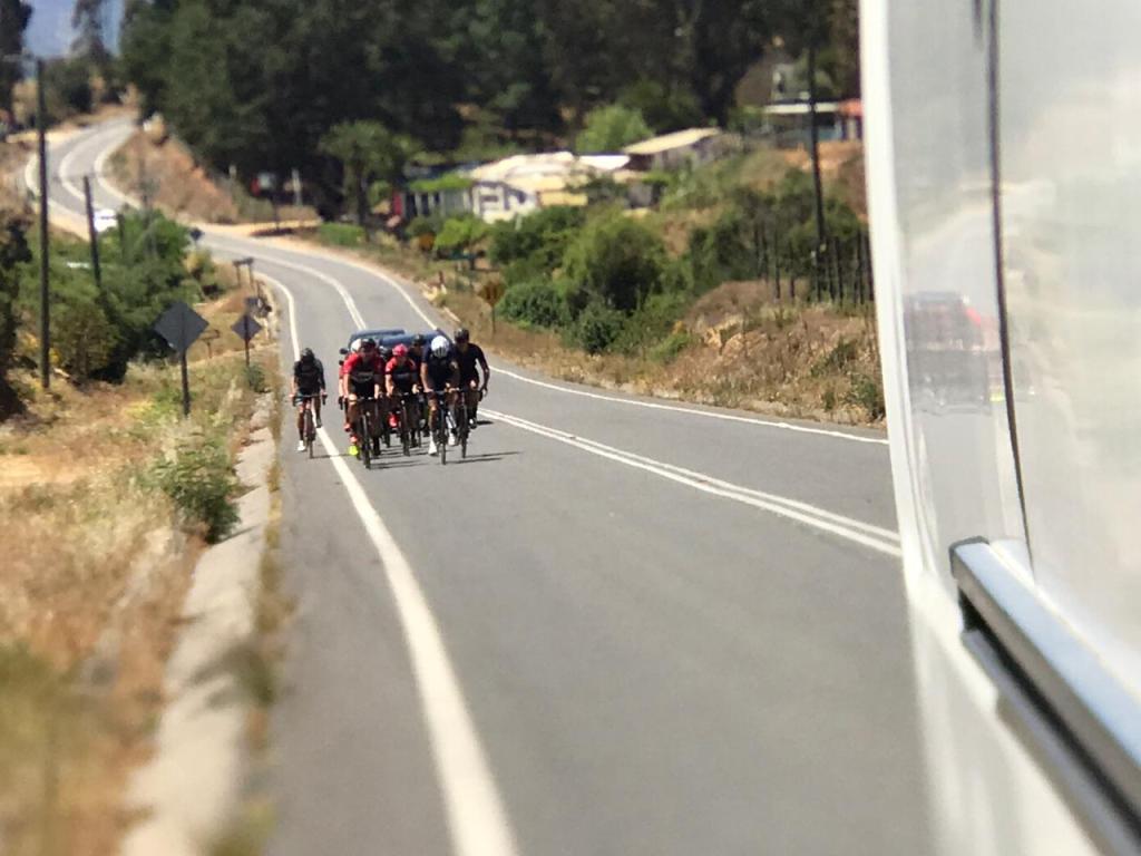 Y ahora durante el rodaje mi gran meta era llegar a Pichilemu (Región de O’Higgins) pero también así me plantee pequeñas metas, la primera fue llegar al primer abastecimiento aproximadamente en el kilómetro 55 donde había un poco de dolor de espalda debido a una cuestas y repechos en la ruta pero nada de preocupación que no me hiciera pensar en llegar a la meta final, con ello fue la posibilidad de poder rellenar caramagiolas, comer una fruta, descansar un poquito, tomar algunas fotos con el grupo y fijar el próximo objetivo hasta el siguiente abastecimiento durante la ruta si dieron momentos de conversar y conocer a los ciclistas de poder compartir algunas experiencia y consejos que sí que los escuche todos, así nos fuimos rodando al segundo abastecimiento y 2da meta cumplida ya aquí había más cansancio, calor 32° y 90 km recorridos y partimos nuevamente a la que sabía sería lo más duro la cuesta de Bucalemu… luego de unos kilómetros y pasado este pueblo llega la famosa cuesta en la Ruta I-500, de tan solo 3 kilómetros pero la sentí eterna, ya me habían hablado de ella pero nunca pensé que sería así jajajajaja… dura para mí, pero nada me hacía pensar que no llegaría, cada uno subió a su ritmo, la mayoría adelante mío, sin embargo mi amiga Anany Muñoz (Seleccionada Nacional de pista y ruta) siempre me acompaño, dándome ánimos y aconsejándome con los cambios de la bici para lograr un mejor pedaleo (aun no los manejo al 100%), más atrás unas amigas en camioneta gritándome “vamos Natuu, tu puedes” lejos fue lo mejor en todas esas curvas que no terminaban, siempre pienso que se puede lograr lo que queremos hacer en todo ámbito y esta vez no fue la excepción, ya en los últimos kilómetros de esta subida y los que ya habían coronado la cima volvieron a apoyar a los que veníamos más atrás, una vez todos en la cima fue el momento de decir “uffff sí que era larga” y también de pensar “quien me mando” jajajajajaja todos lo hemos pensado esto último.