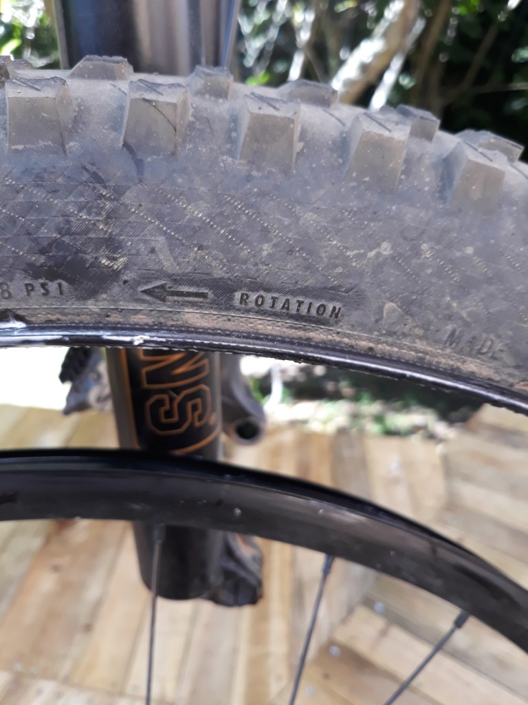 Empieza la parte final, montar nuestro neumático nuevo. Primero debemos encontrar el indicador de sentido de rotación en el neumático. Tomamos como referencia que el disco está al lado izquierdo de las ruedas por lo que si ponemos la rueda con el disco mirándonos y flecha del neumático en la parte superior de la rueda, ésta debería apuntar hacia la izquierda.