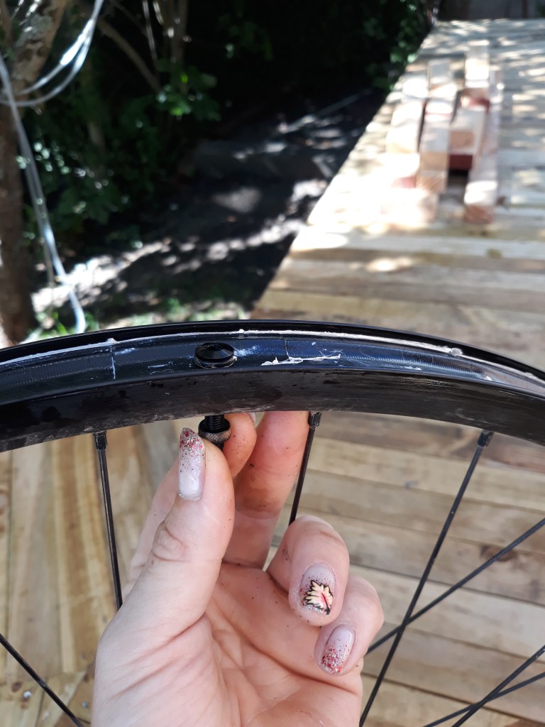 ¡Ahora vamos a limpiar todo! Revisamos que nuestra rueda tenga la cinta que sella la parte que tiene la perforación de los rayos. Si la tiene y no tiene ninguna parte rota o mal instalada estamos listas, de otra forma puede que necesitemos una cinta nueva (las bicis Specialized vienen con una cinta de recambio para esa eventualidad), puede ser reutilizable o adhesiva.